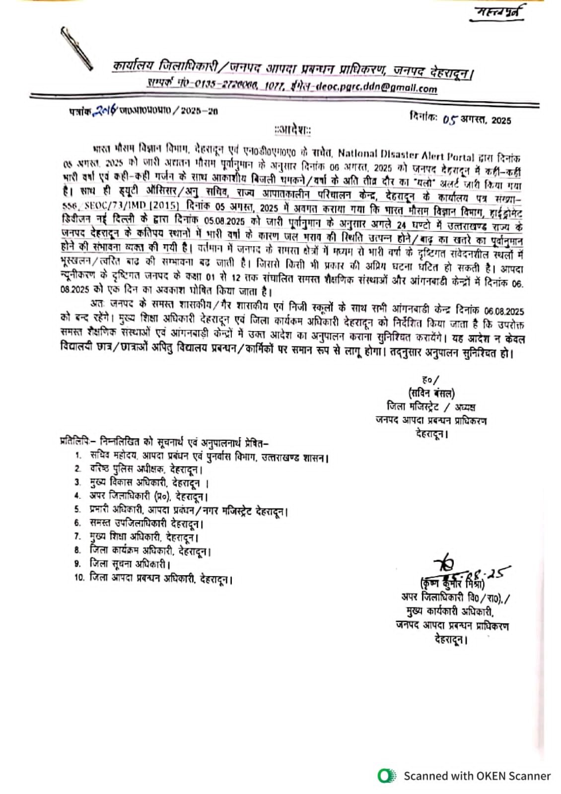 उत्तराखंड, देहरादून: प्रदेश में लगातार हो रही बारिश के बीच जिला प्रशासन ने छुट्टी के दिए आदेश कक्षा 1 से 12 तक कक्षा की छुट्टी के आदेश आंगनवाड़ी केन्द्रों में भी रहेगा अवकाश